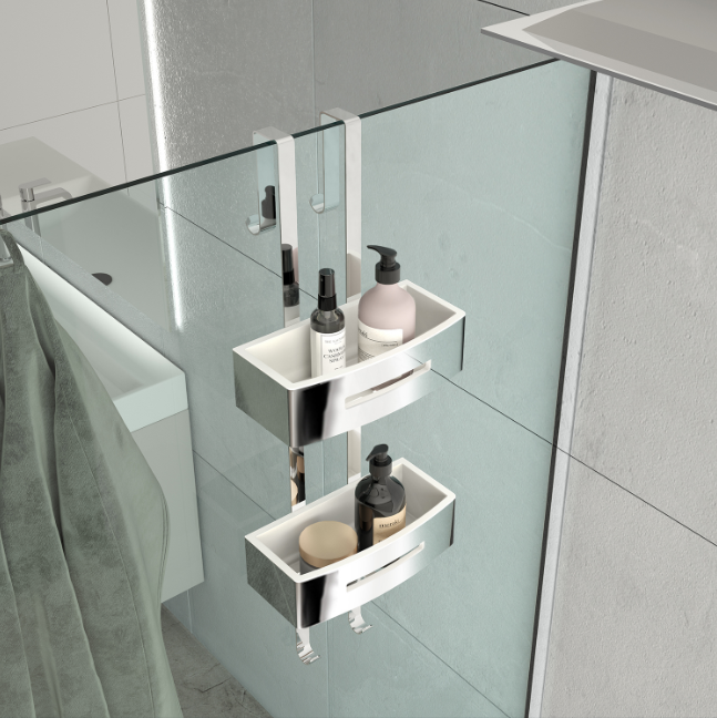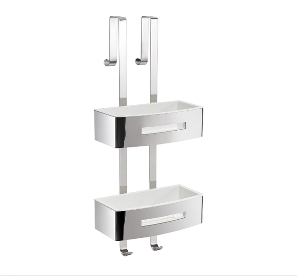 Portaoggetti Doccia Appendibile a 2 Ripiani in acciaio inox, resistente e pratico da pulire grazie alle vaschette in resinadi colore bianco estraibili.