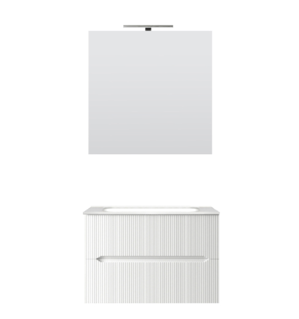 La base è realizzata esternamente in mdf rivestito in polimerico, i cassetti hanno la caratteristica maniglia a gola e il sistema soft-closing. Cassetto superiore con vano sifone.